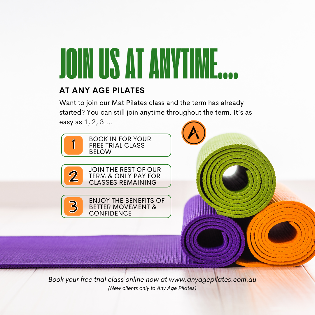 Don’t wait for a new term to start…start today! Join Any Age Pilates at any time! Book in for your free trial class and only pay the remainder of term after your trial. No contracts, no lock in terms and conditions. So, join us to boost your strength, mobility and confidence - with expert guidance and a supportive inclusive community every step of the way.
